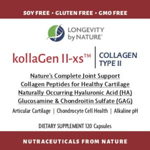 kollaGen II-xs Hydrolyzed Collagen Type II sourced from Avian Chicken Sternum Cartilage. Low molecular weight (20kDa), amino acid protein composition is 65% and 35% natural occurring hyaluronic acid, glucosamine and chondroitin. kollaGen II-xs a highly therapeutic connective tissue formula for optimum articular cartilage support, and chondrocyte cell health throughout the extracellular matrix. kollaGen II-xs Nature’s Complete Joint Support.